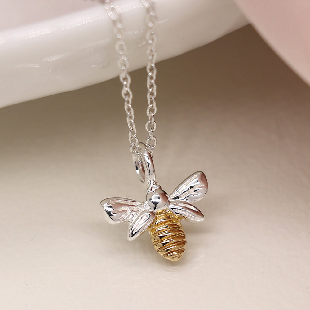 Sterling silver fine chain necklace with a dainty bee pendant featuring a gold plated body, presented in a pretty gift box.